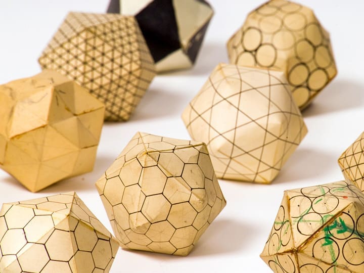 Multiple light-colored, geometric, multifaceted objects with various patterns like hexagons, circles, and intersecting lines, scattered on a white surface.
