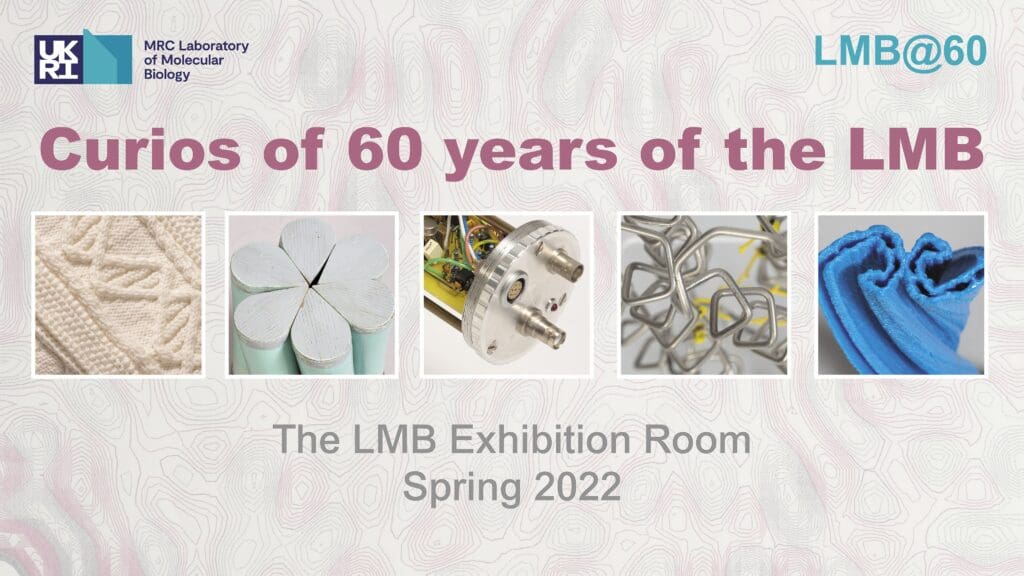In an exhibition celebrating 60 years of the LMB, an assortment of curios – unusual and intriguing items – was gathered together to give a glimpse into the life and work of the LMB. From scientific models to restaurant menus, Nobel Prize telegrams and a special lab coat, visitors could find out more about the LMB from some of the objects made and collected through the decades.