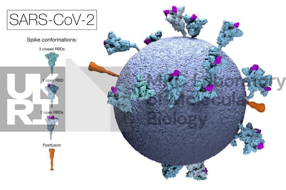 3D model of SARS-CoV-2 created at the MRC Laboratory of Molecular Biology using electron cryo-tomography (cryo-ET) data analysed by John Briggs’ group and collaborators, published in Nature. This model of an authentic virus particle reveals positions, conformations and orientations of the spike proteins on the virion membrane (blue). RBD = Receptor Binding Domain. |