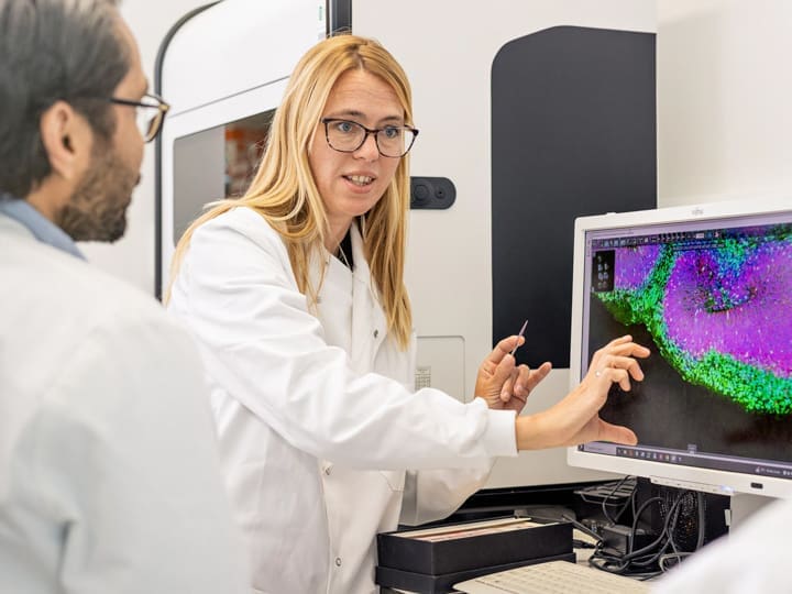 Woman in lab coat points at a colourful scientific image on a monitor, holding a small tool, while a man in a lab coat listens.