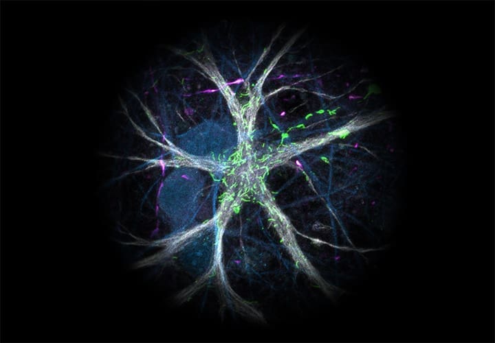 Tau protein inside brain support cells (astrocytes), shown as green fluorescent dots. Find out how this research helps us understand neurodegenerative diseases.