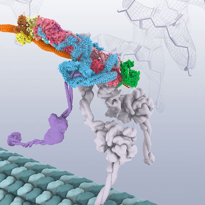 The structures show the BICD2 adaptor sandwiched between the other two complexes. Dynactin lies alongside it, and the dynein motor wraps around the outside of them both, opening up spaces between some of the dynein subunits as it curls around. This opening up of dynein suggests how the presence of dynactin could activate the motor. This work shows the power of cryo-EM to reveal structures that would have been almost impossible to solve only a few years ago, and highlights the importance of the rapid recent advances in cryo‑EM.