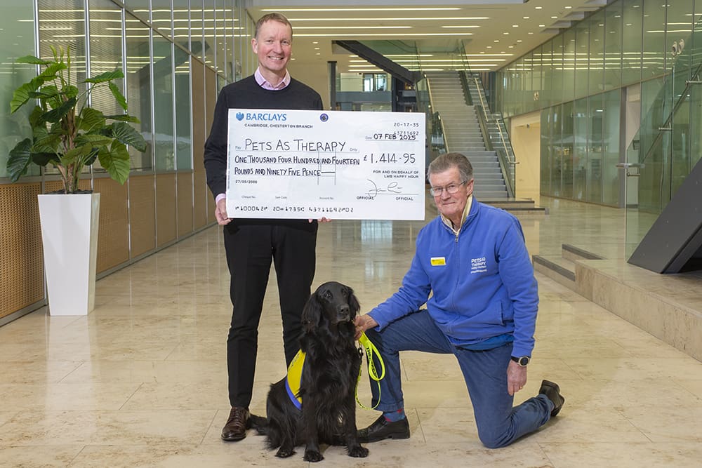 As has been tradition for over 50 years, the LMB once again came together in December 2024 to raise money for charity with the annual Christmas raffle. Each year, a new charity is chosen, and this year over £1400 was collected in aid of Pets As Therapy. We were delighted to be visited by Pets As Therapy volunteer Charles and one of his dogs last week, where they were presented with a cheque by LMB Director Jan Löwe.