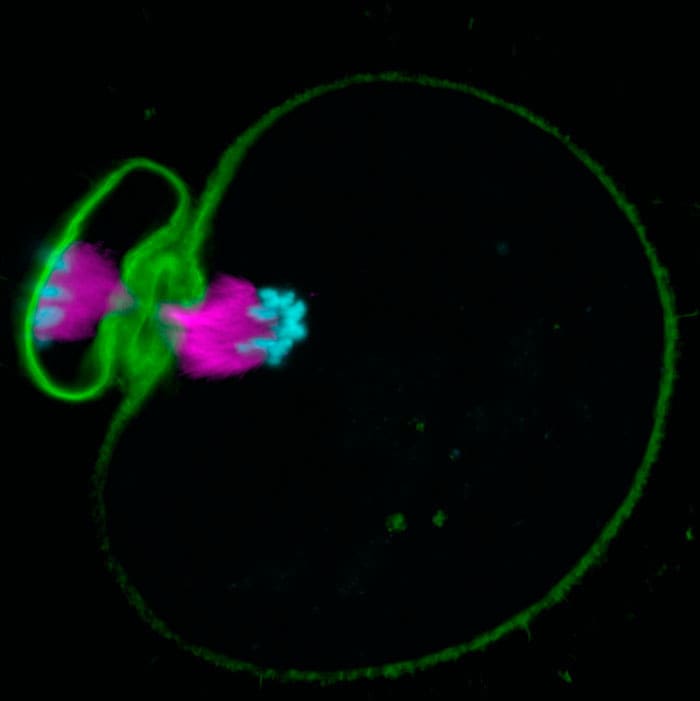 During fertilisation, an egg and a sperm fuse to form a new embryo. To create the egg, a precursor cell called an oocyte undergoes meiosis: a specialised form of cell division in which half the chromosomes are separated away leaving exactly the right number of chromosomes in the egg. Meiosis in human oocytes is highly error-prone, which can cause the egg to have the wrong number of chromosomes. This is known as aneuploidy and is the leading cause of pregnancy loss and genetic disorders such as Down’s syndrome. Despite the significance of this process, little is known about the genes involved. Melina Schuh’s group, in the LMB’s Cell Biology Division, has now developed screening techniques for meiotic genes, leading to the discovery of a number of genes that are essential for meiosis in mammals.