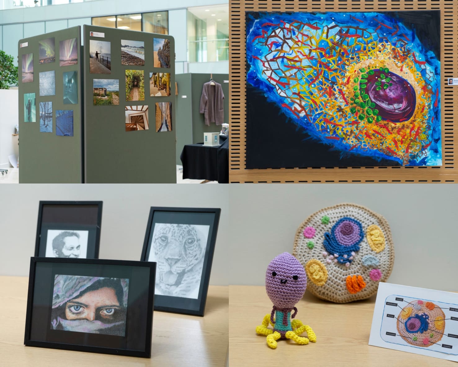 The display in the atrium of the building featured work across a wide range of different media including knitting, needlework, scientific painting, highly detailed drawings, models, tapestry, ceramics, mosaics, crochet, prints, jewellery, and homemade cards. Another featured art form was photography and the work of several participants showed travel pictures, natural landscapes, and architecture.