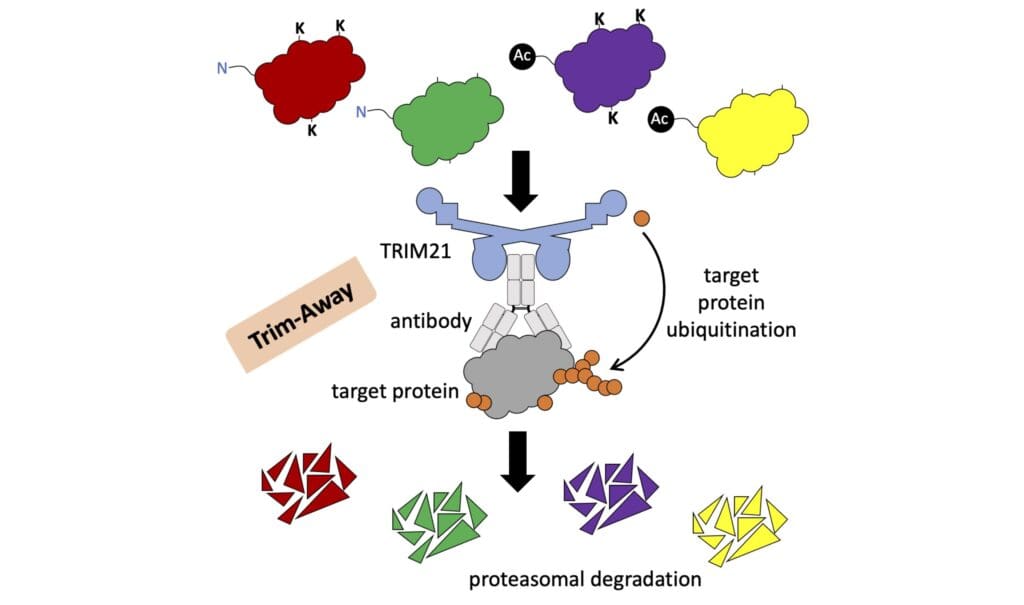 Reconstituting Trim-Away in vitro revealed that, in addition to ubiquitinating itself, TRIM21 can also directly ubiquitinate antibody-bound proteins. Furthermore, proteins targeted by Trim-Away inside living cells were found to be ubiquitinated prior to their degradation. The finding that Trim-Away degrades proteins by directly ubiquitinating them led the researchers to ask which residues ubiquitin is attached to. Surprisingly, they found that if they removed all lysine residues from a protein and blocked its N-terminus by acetylation the protein was still efficiently degraded by Trim‑Away.