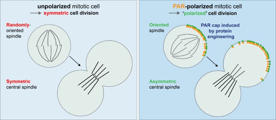 Asymmetric cell division is the process by which one cell divides into two daughter cells that have different fates. Asymmetric division is the hallmark of stem cells: one daughter cell specialises to perform a specific function in the organism, while the other becomes another stem cell that keeps the ability to divide. We are interested in understanding how cell fate determinants segregate during asymmetric division. Specifically, we focus on understanding the molecular and physical mechanisms by which cytoskeleton tracks can be polarised by cortical polarity cues, and how, in turn, this polarised network of tracks are ‘read’ by molecular motors to carry endosomes containing the right cell fate determinants into only one daughter cell. Our long-term vision is to capitalise on this work in asymmetric cell division to establish the rules of polarised transport, which could apply to other polarised cells, such as neurons.