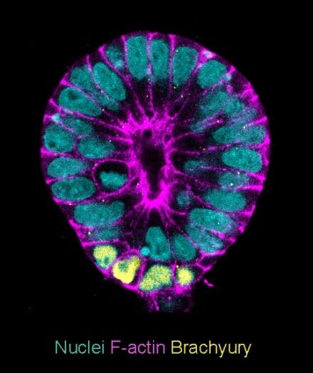 3D culture of stem cells showing different cellular identities. F-actin marks cell shapes and Brachyury differentiated cells (Sato et al., Dev Cell, 2024).